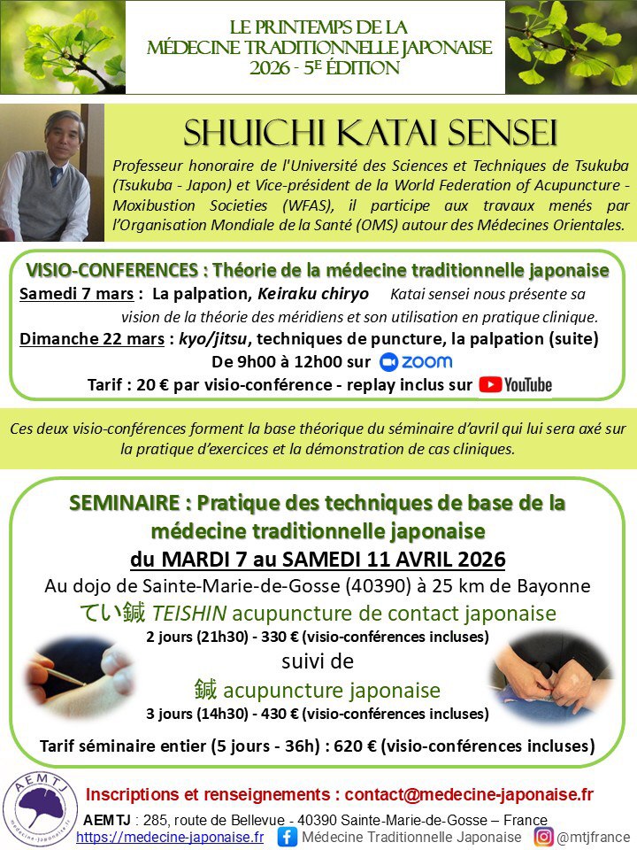 Début 2026, 2 visio-conférences de Shuichi Katai Sensei les 7/03 et 22/03 en préparation du séminaire prévu du mardi 7 au samedi 11 avril 2026.